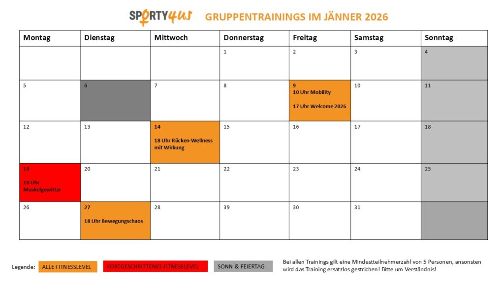 Gruppentrainings bei sporty4us. Das heißt sich gemeinsam zu bewegen, um fit und gesund zu werden oder fit und gesund zu bleiben. Cintia und Vera präsentieren dabei spezielle Übungen zum Mitmachen mit unterschiedlichen Schwerpunkten, damit die Teilnehmerinnen ihren eigenen Fitness-Level verbessern können. Kraft, Ausdauer, Koordination und Beweglichkeit stehen dabei im Vordergrund.